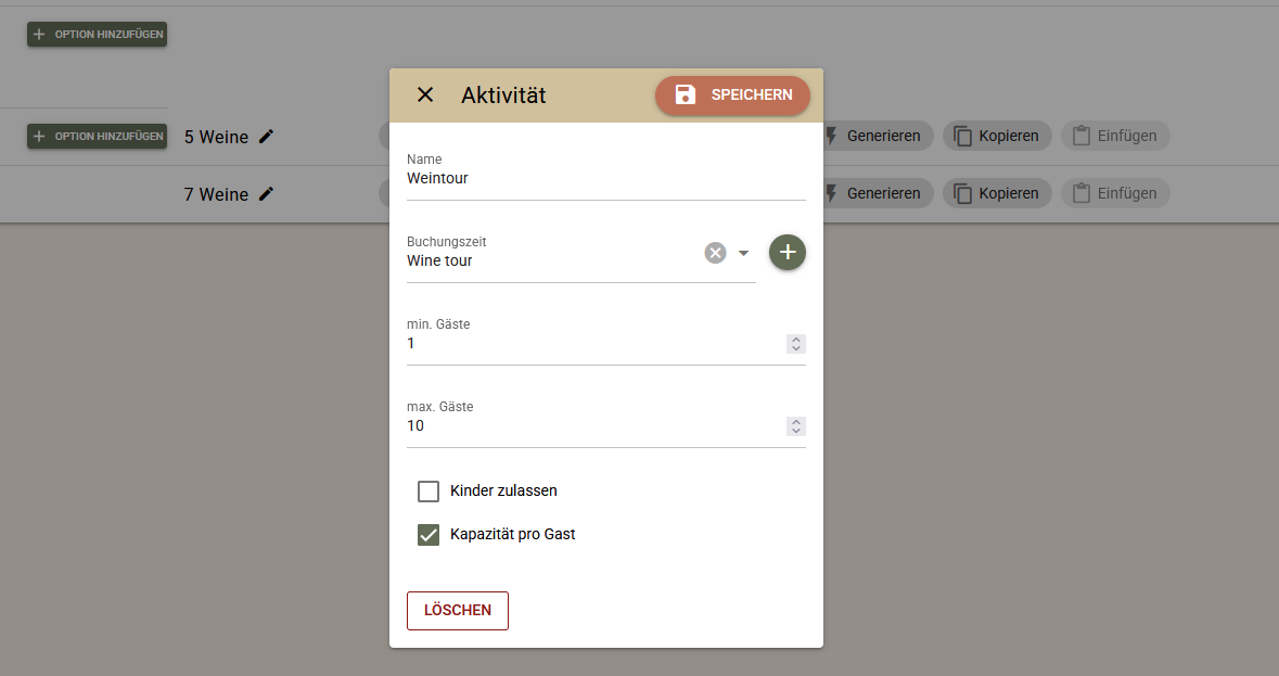 In diesem Beispiel bietet das Hotel zwei Optionen für eine Weintour an – „5 Weine” und „7 Weine” – jeweils zu unterschiedlichen Preisen.