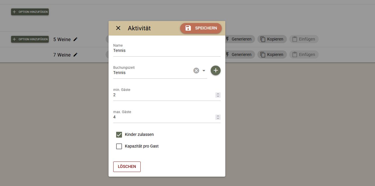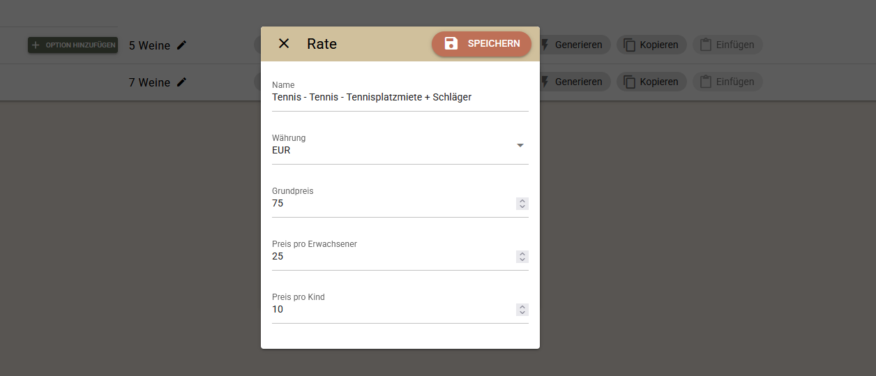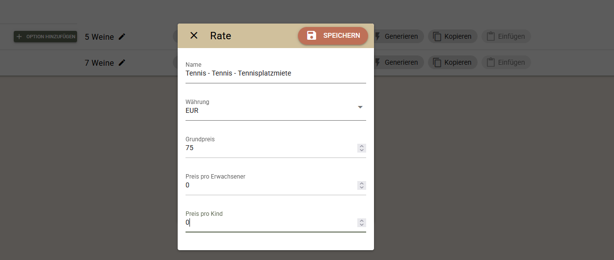 - Erstellen Sie eine neue Rate mit dem Namen Weintour – 7 Weine und geben Sie den Preis pro Erwachsener ein.