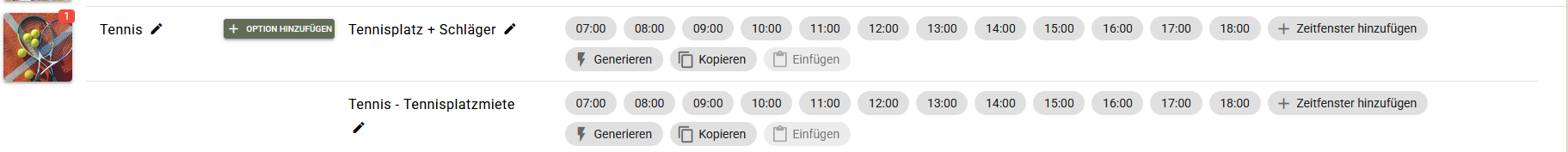 - Kopieren Sie die generierten Zeitfenster aus der ersten Option (Platzmiete) und fügen Sie sie in die beiden anderen Optionen ein (Platz + Schläger und Platz + Schläger + 4 Bälle).