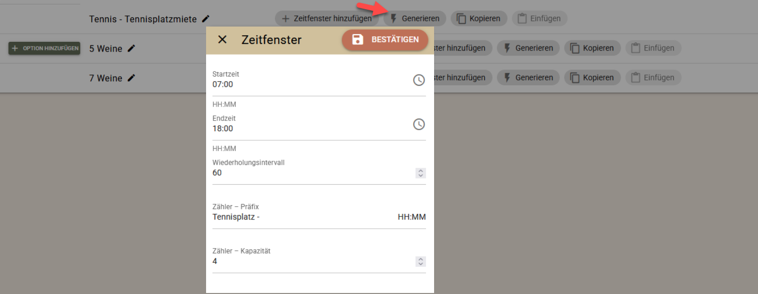 - Klicken Sie auf Zeitfenster generieren. - Startzeit: 07:00