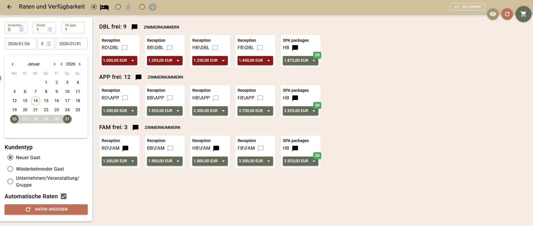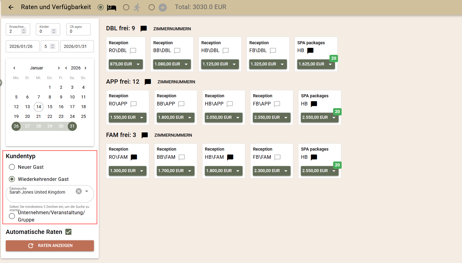 Der Kundentyp kann im Voraus ausgewählt werden, was die automatische Ratenauswahl und das Übertragen von Informationen zu Buchungen erleichtert.