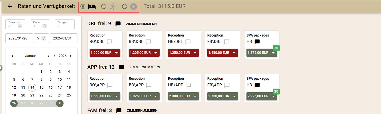 Über die Optionsfelder und den Bildschirmtitel können Sie auswählen, was Sie buchen möchten: Zimmer, Aktivitäten oder Zusatzleistungen.