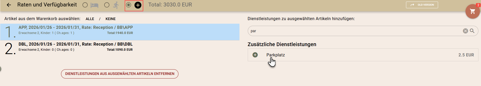 Nachdem Sie Zimmer oder Aktivitäten in den Warenkorb gelegt haben, können Sie noch vor der Erstellung der Buchung Zusatzleistungen (z. B. Abendessen, Parkplatz, Kinderbett) hinzufügen. Beim Speichern als Anfrage werden die ausgewählten Leistungen auf die endgültige Buchung übertragen.