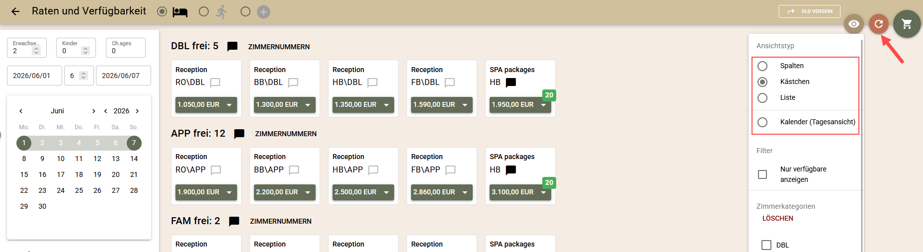 Wir haben eine neue und deutlich verbesserte Version der Ansicht „Raten und Verfügbarkeit” eingeführt, die die Arbeit mit Buchungen erleichtert und eine bessere Übersicht über Preise, Verfügbarkeit und zugehörige Informationen bietet.