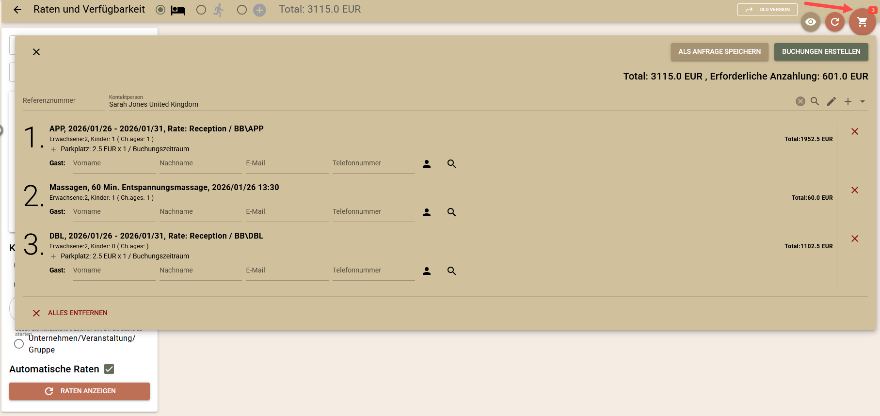 - Hinzufügen einer oder mehrerer Zimmerbuchungen mit einem Klick