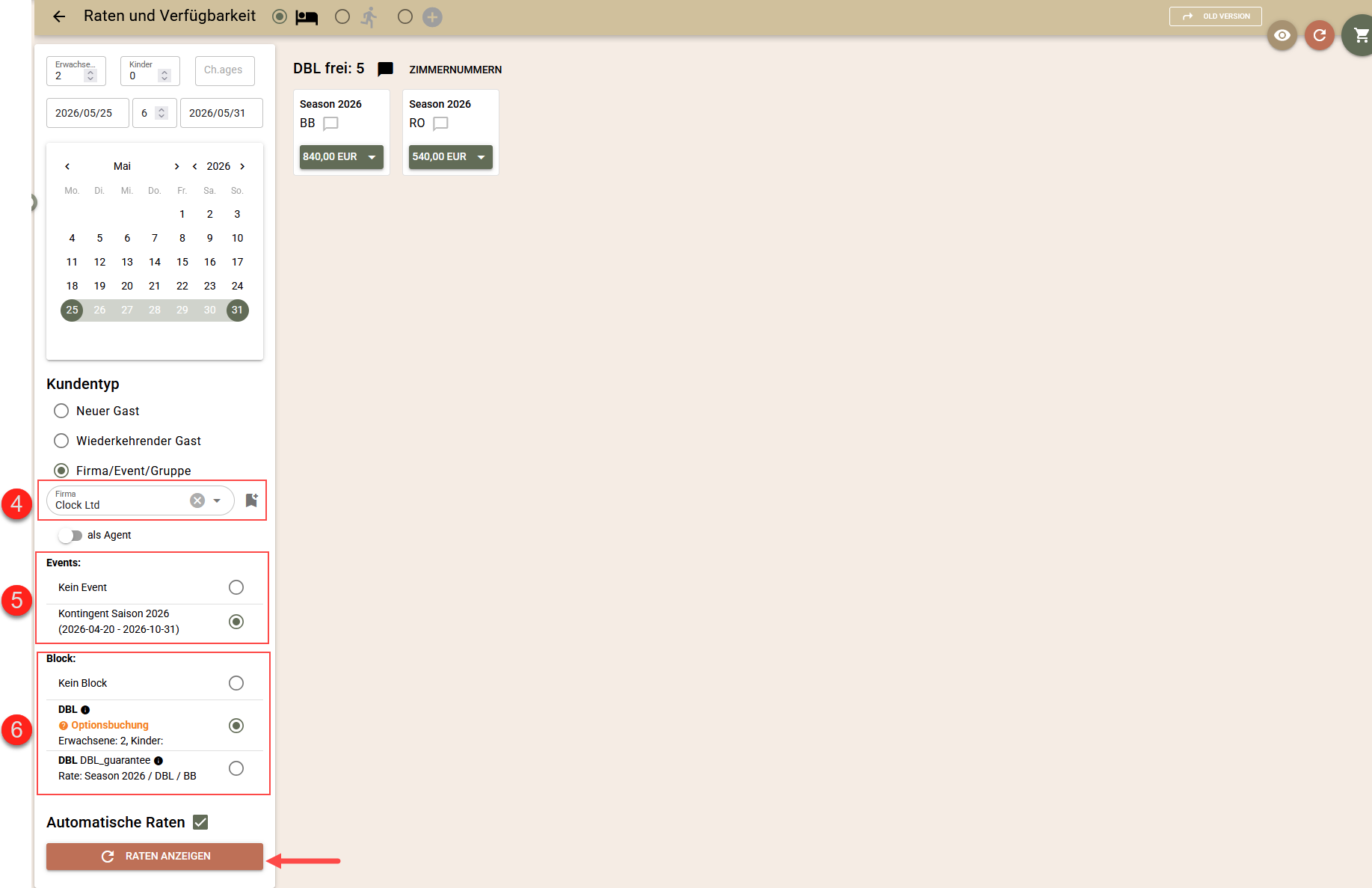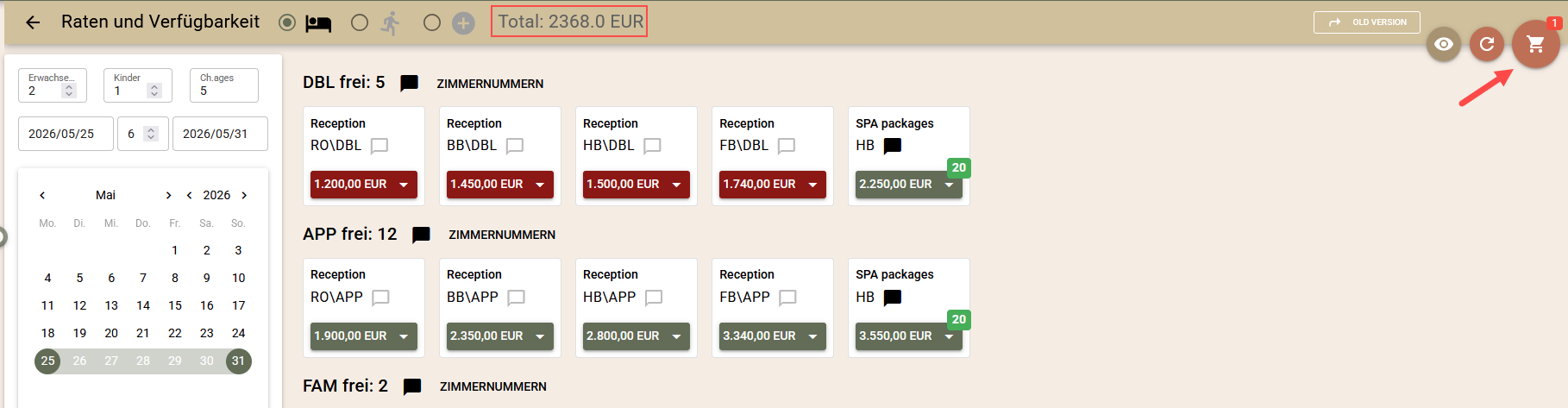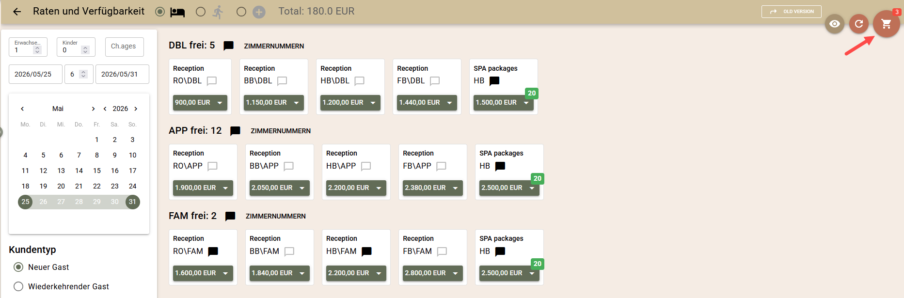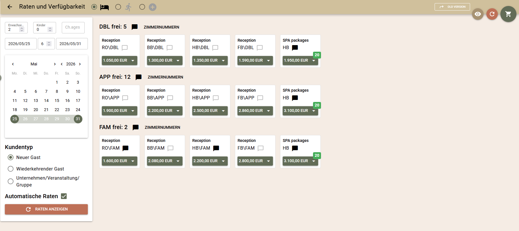 In diesem Artikel sehen wir uns Schritt für Schritt an, wie Sie die Ansicht „Raten und Verfügbarkeit” verwenden – von der Auswahl eines Kunden und einer Rate über die Arbeit mit dem Warenkorb bis hin zum Abschluss der Buchung.