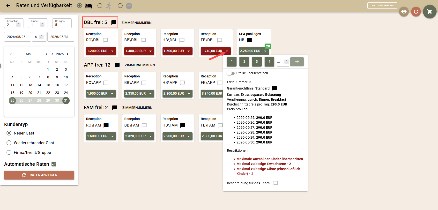 Die Ansicht „Raten und Verfügbarkeit” ist das wichtigste Tool für die Berechnung, Preisauswahl und Erstellung von Buchungen im System. Er vereint die Arbeit mit Zimmern, Aktivitäten, Zusatzleistungen, Kunden und Blöcken in einem Prozess und bietet einen klaren Überblick über Preise, Verfügbarkeit und Bedingungen, noch bevor die Buchung selbst erstellt wird.