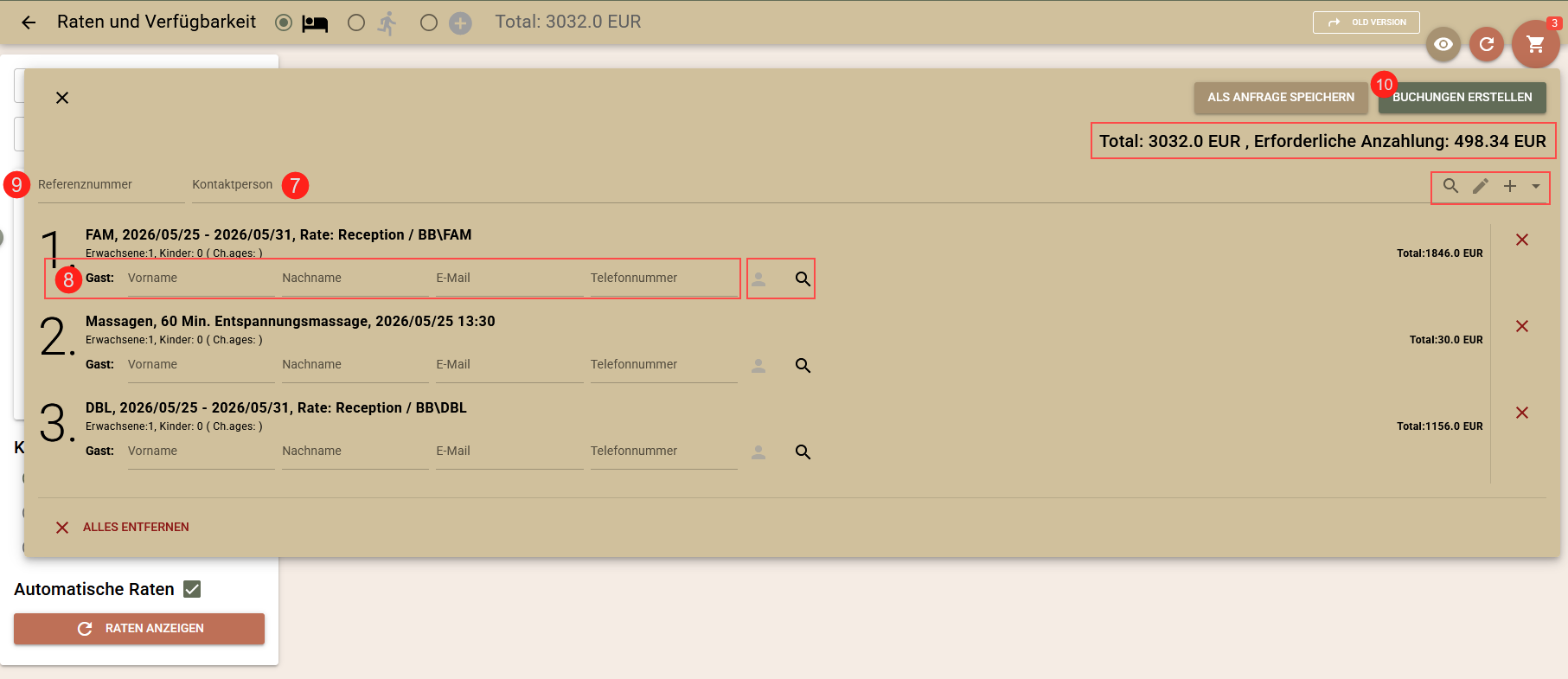 Nachdem Sie sich vergewissert haben, dass die Buchungen im Warenkorb korrekt hinzugefügt wurden und Sie die erforderlichen Informationen eingegeben haben, bestätigen Sie deren Erstellung über die Schaltfläche „Buchungen erstellen” (10).