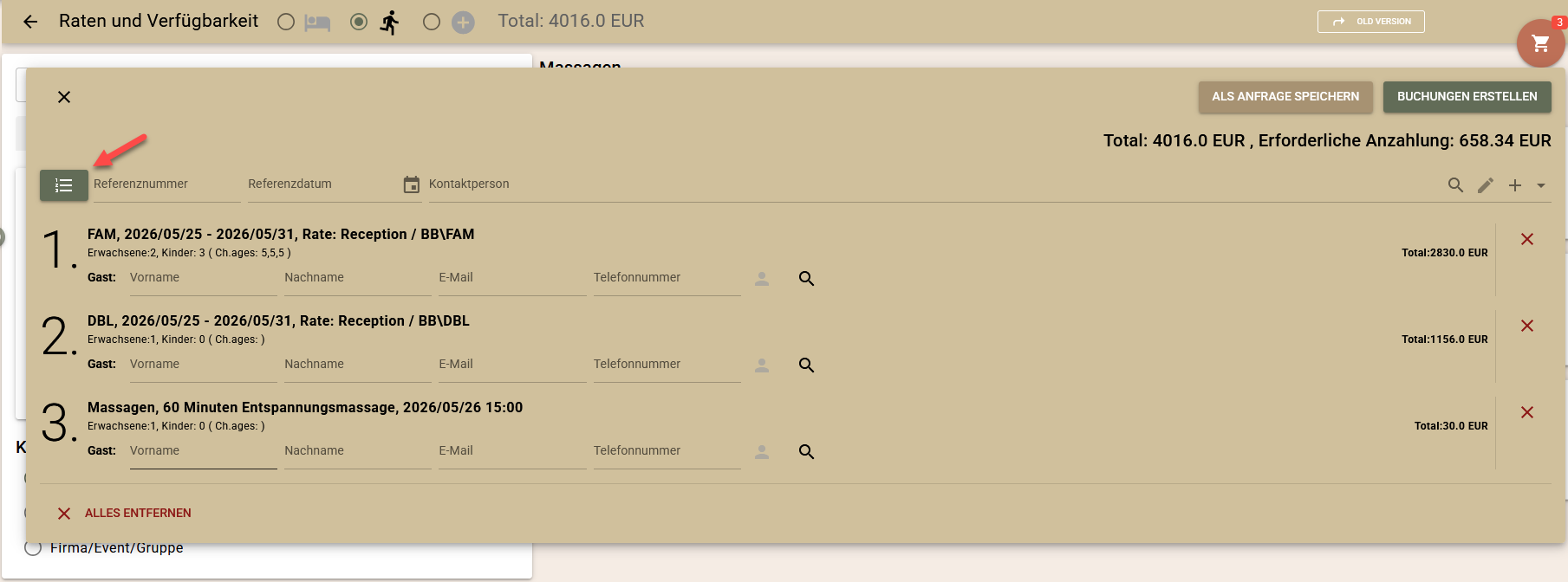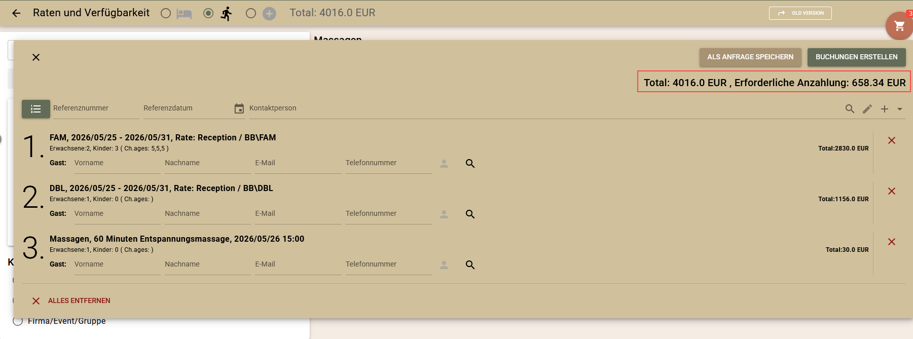 Sie sehen alle hinzugefügten Buchungen. Für jede Buchung wird ein Endpreis berechnet, und über der Liste der Buchungen werden der Gesamtbetrag aller Produkte im Warenkorb und der Betrag der Erforderlichen Anzahlung angezeigt.