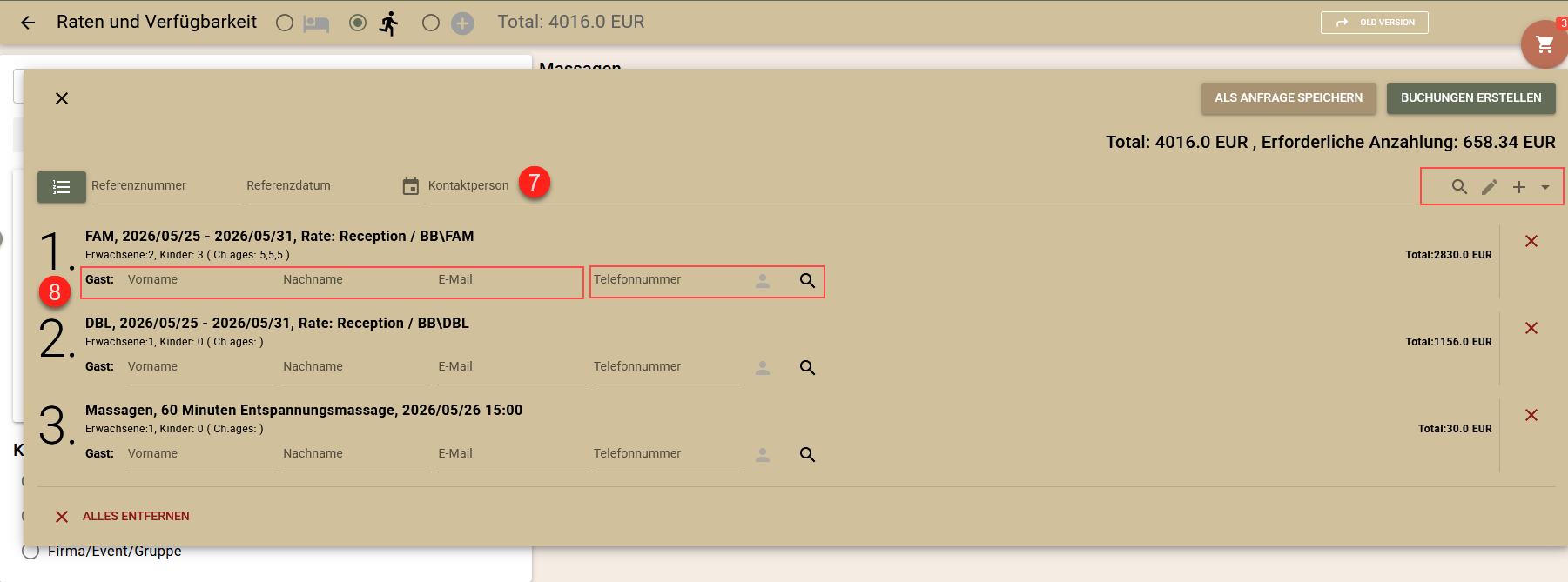 - Kontaktperson (7) – Sie können ein bestehendes Gastprofil auswählen oder ein neues Profil erstellen, das als Kontaktperson für die Buchungen im Warenkorb gespeichert wird. Um bestehende Profile zu suchen, verwenden Sie die Schaltfläche mit der Lupe und um ein neues Profil hinzuzufügen, die Schaltfläche “+“. Das System schlägt automatisch Profile vor, die mit der ausgewählten Firma oder dem wiederkehrenden Gast verknüpft sind.
