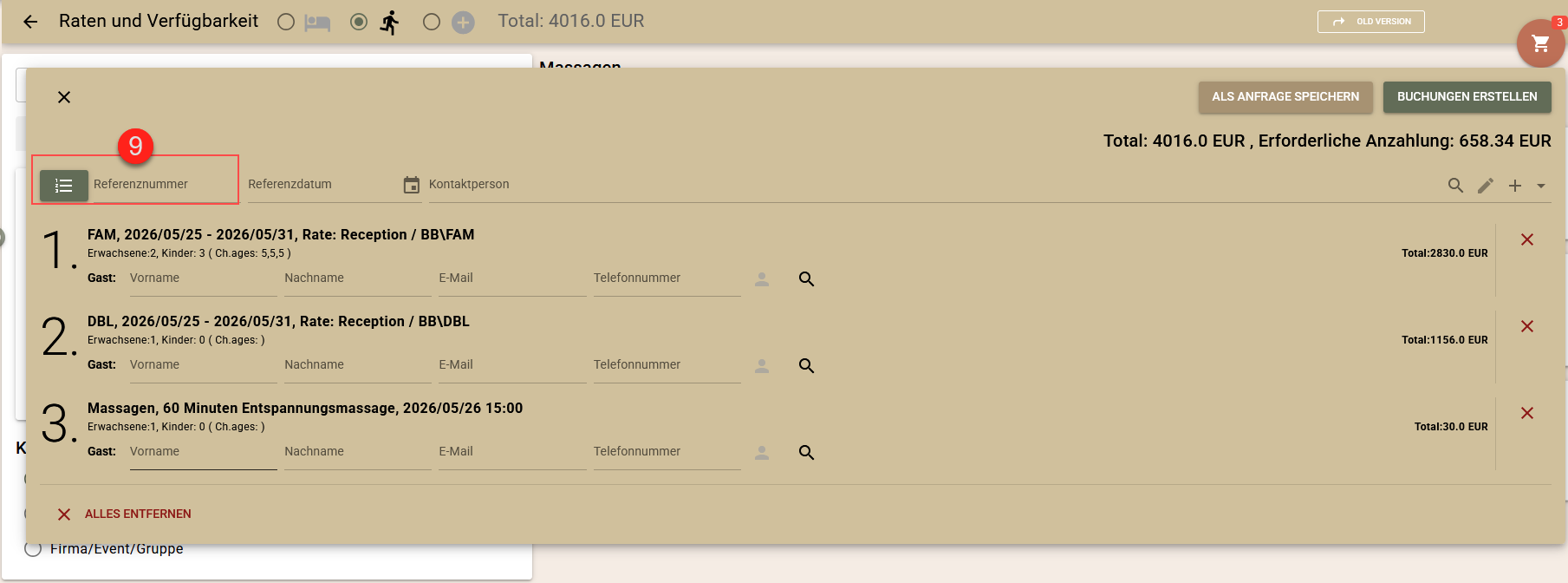Wenn Sie sich vergewissert haben, dass die Buchungen im Warenkorb korrekt hinzugefügt wurden und Sie die notwendigen Informationen ausgefüllt haben, bestätigen Sie deren Erstellen über die Schaltfläche “Buchungen erstellen“ (10).
