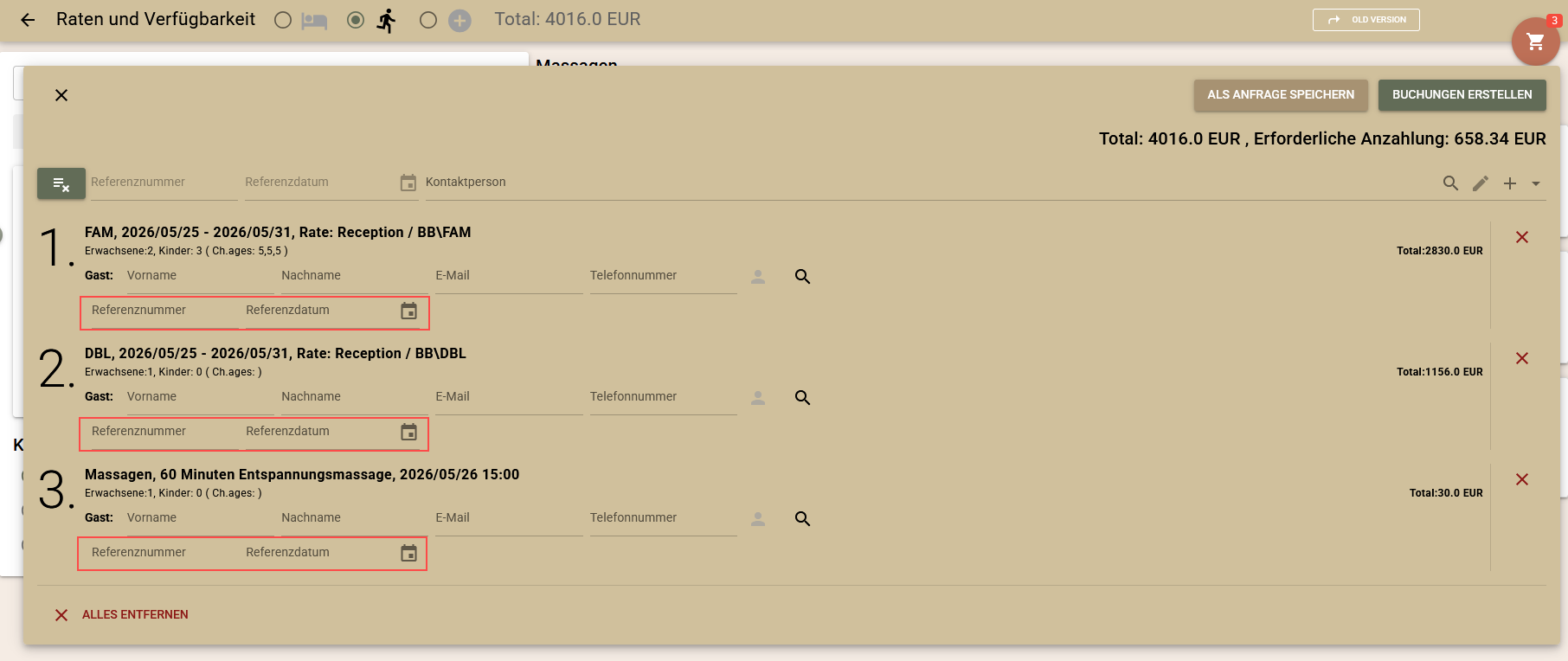 Die Referenzdaten umfassen Referenznummer und Referenzdatum. Die Referenznummer dient als Gruppierungsmerkmal für die Buchungen, auf die sie angewendet wird, und das Referenzdatum kann für die Preisberechnung wichtig sein (z. B. für Rabatte im Rahmen von Reiseveranstaltervereinbarungen). Sie können eine gemeinsame Referenz für alle Buchungen im Warenkorb oder separate Referenzdaten für jede Buchung festlegen.