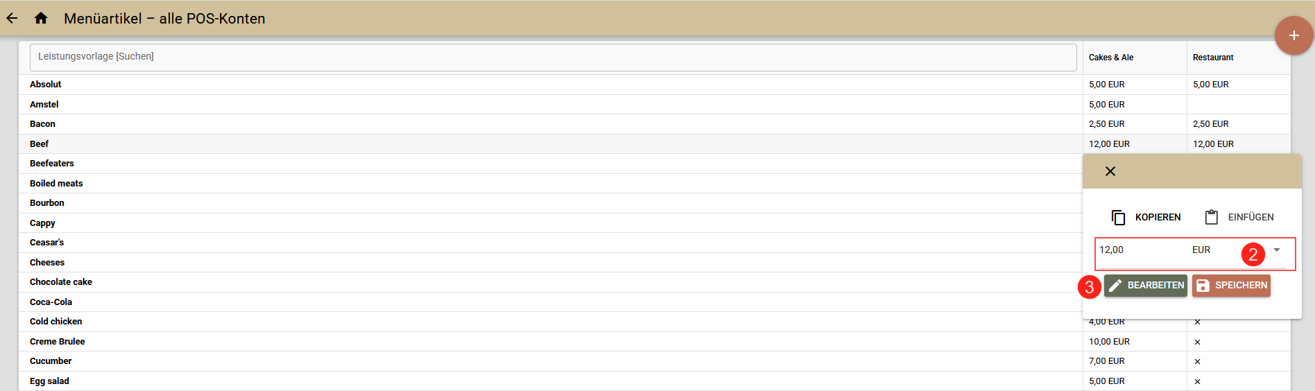 - Klicken Sie in eine Zelle, um die Anpassung des Preises direkt durchzuführen (2).