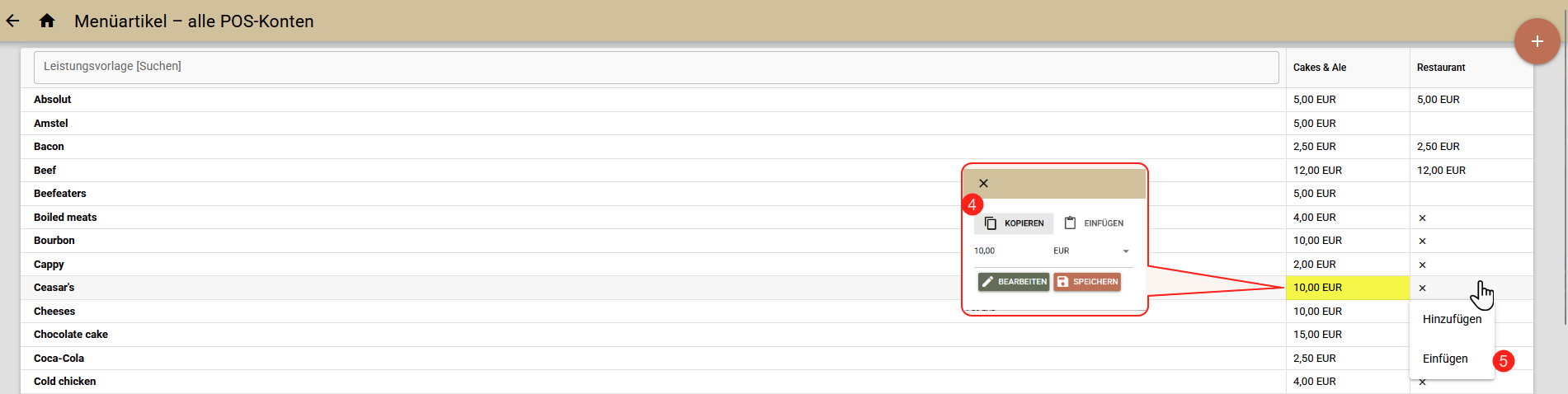 - Kopieren Sie einen Artikel (4) aus einem POS und fügen Sie ihn(5) in einen anderen (oder mehrere) ein. Beim Einfügen des Artikels wird der vollständige Editor geöffnet, damit Sie die Informationen überprüfen und gegebenenfalls Korrekturen vornehmen können.