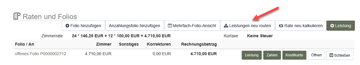 Die Funktion ist über den Buchungsbildschirm, Abschnitt "Rate und Folios" → "Leistung neu routen" erreichbar.