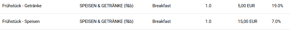 Das bedeutet, dass Ihre Frühstücksleistung, die Sie als Extra anbieten, künftig als zwei separate Leistungen auf dem Folio gebucht werden muss: