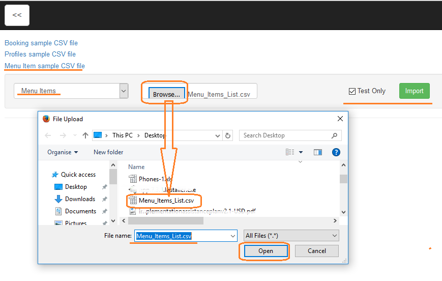 Once you have entered your menu item information in the file, upload it using 'Choose file' option and run a consistency test by selecting 'Test only' (2) and then the 'Import' button. If there are no errors presented, upload the file again and use the 'Import' button straight away.
