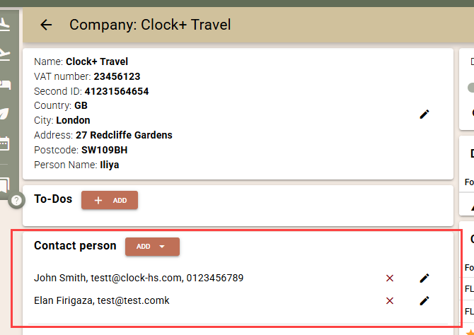 The Contact Person functionality can also be used on the Company screen. You can add multiple Contact Persons to a Company. Apart from being reference info on the Company screen, you can easily choose Contact Persons in the bookings from ones related to the given Company. Please, see the screenshots below: