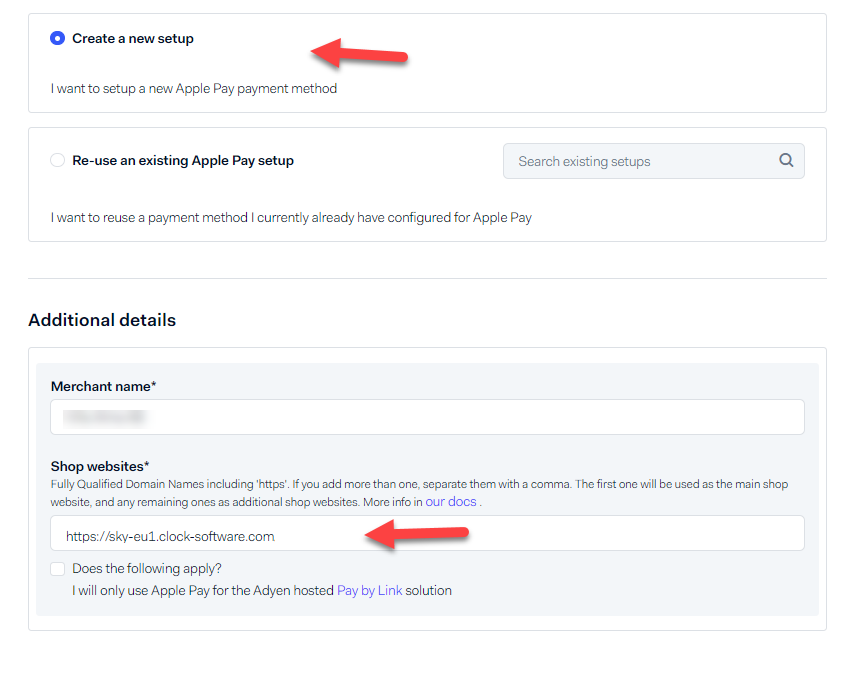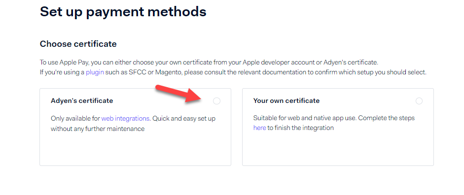 When adding Apple Pay as a Payment Method in Adyen, choose to use Adyen's Apple Pay Certificate.