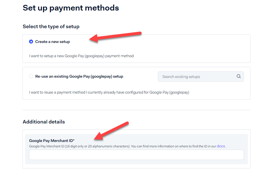 - add Google Pay as a (ecommerce) Payment method in Adyen, select 'Create a new setup' and add your Google Pay Merchant ID