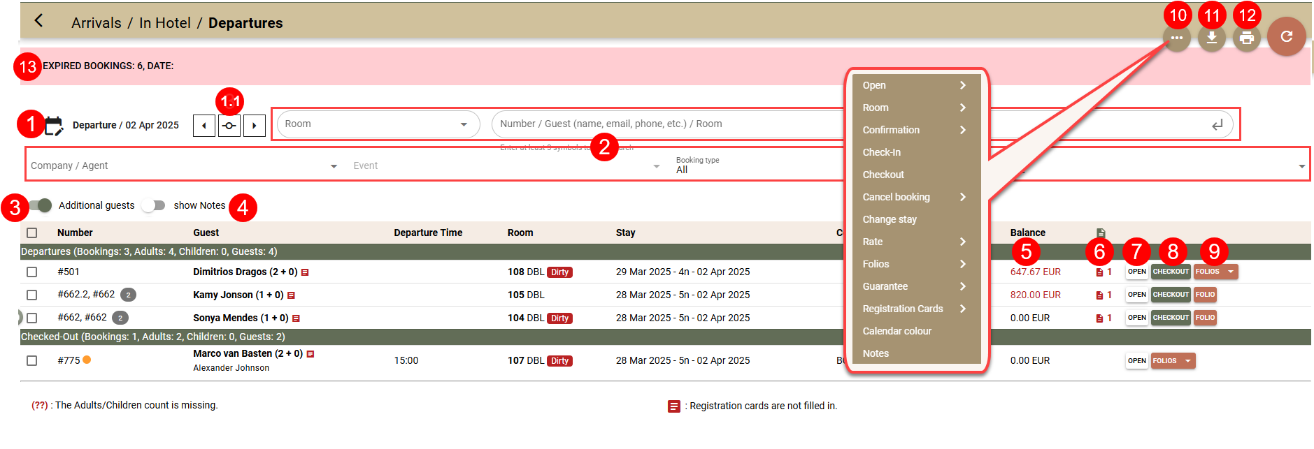 The bookings are divided into two groups - Departures and already Checked-Out. Here are the screen's options: