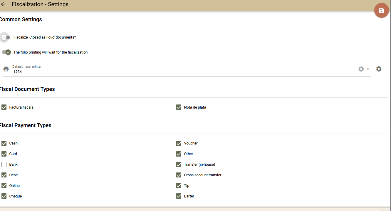 5. Setup your fiscalization settings from Settings -> Fiscalization -> Romanian fiscal policy