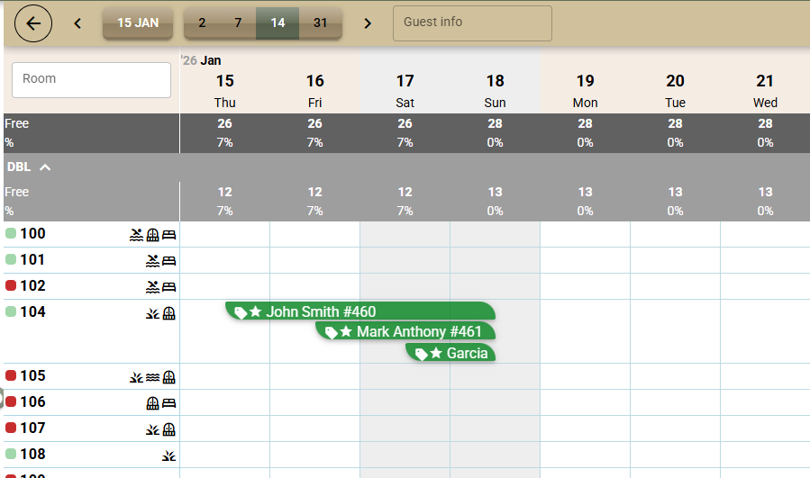 - Open the next booking for edit and select the same room number from the list in the "Arrival Room". Save.;