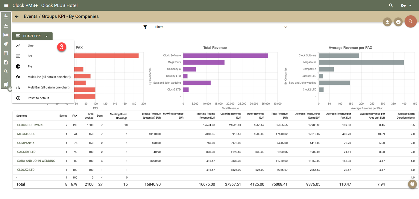 The KPI reports examine numerous important and specific key performance indicators for business activity and allow for various data slicing and analysis. In addition to Net or Gross Revenue, the reports also calculate indicators such as Total Area of Rented Rooms and Average Revenue per Unit Area, Total Guests Using the Rooms and Average Revenue per Guest, Average Booking Duration for a Room, etc. These indicators can be viewed in various segments: By Day, by Month, by Company, by Event, by Marketing Indicators (Source, Segment, Channel), by Pipeline Statuses, by Agent or Summarised.