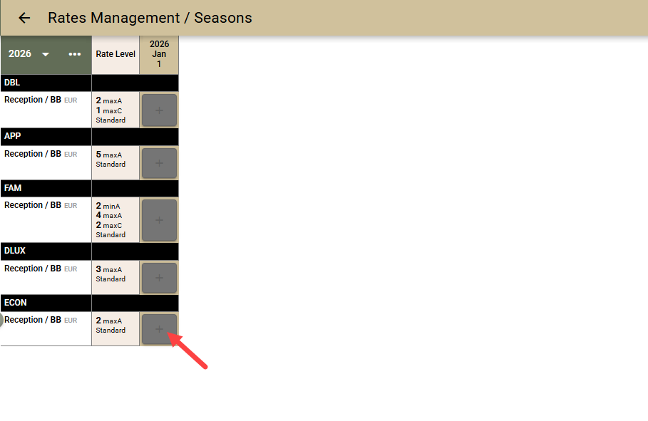 After adding the start date of the season, we proceed to configure the prices for the first room type, Economy Room (ECON).