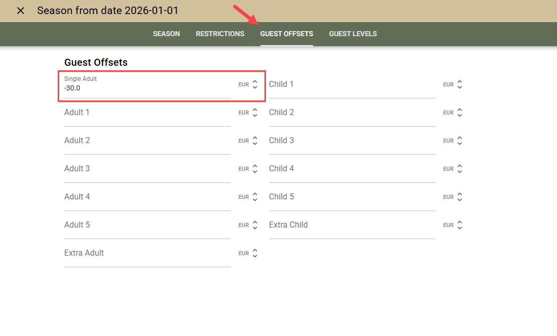- Let's set up the exception. To reflect the price for single occupancy, we will use guest offsets.