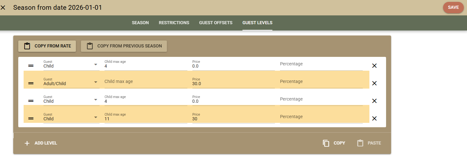 - Add another Child Level, with a maximum age of 11 and rate 30 - if the third guest is a child over 5 years old, an additional charge of 30 is added.