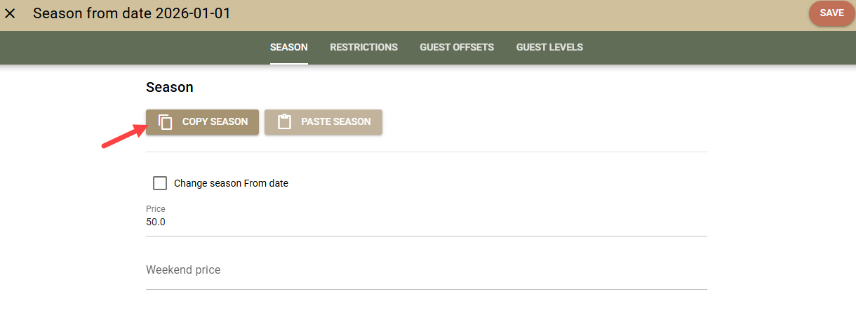 - Click in the empty cell of the season for the next rate → "Paste season".