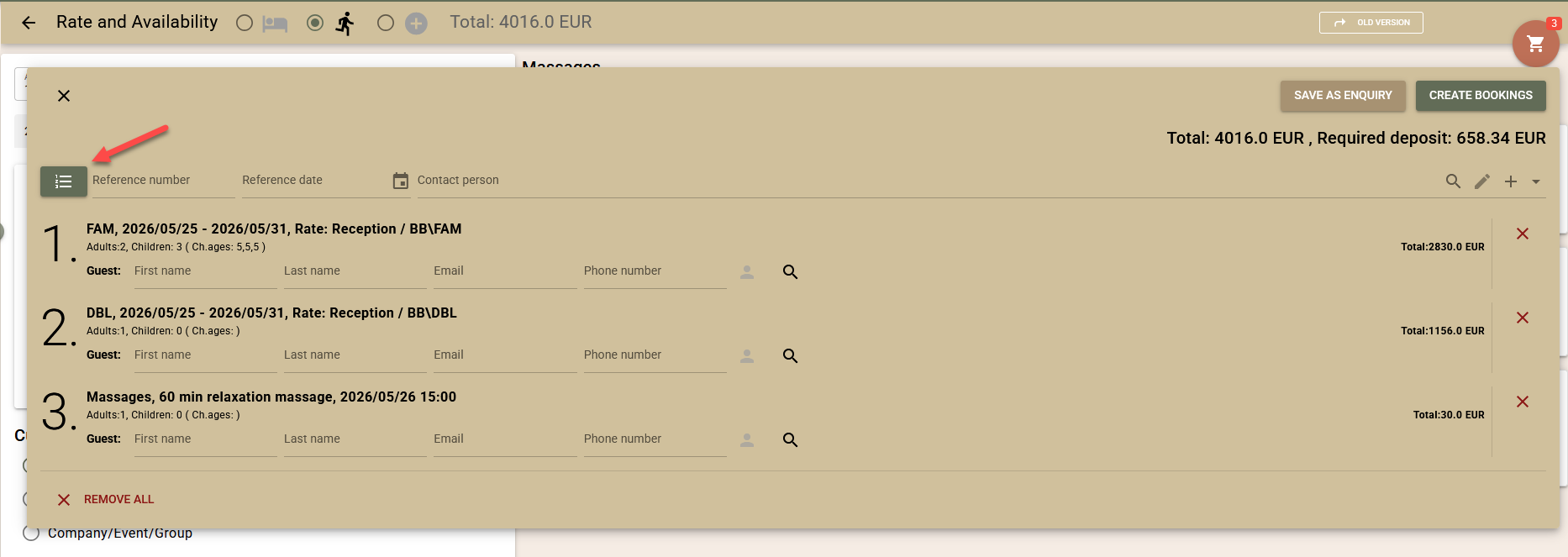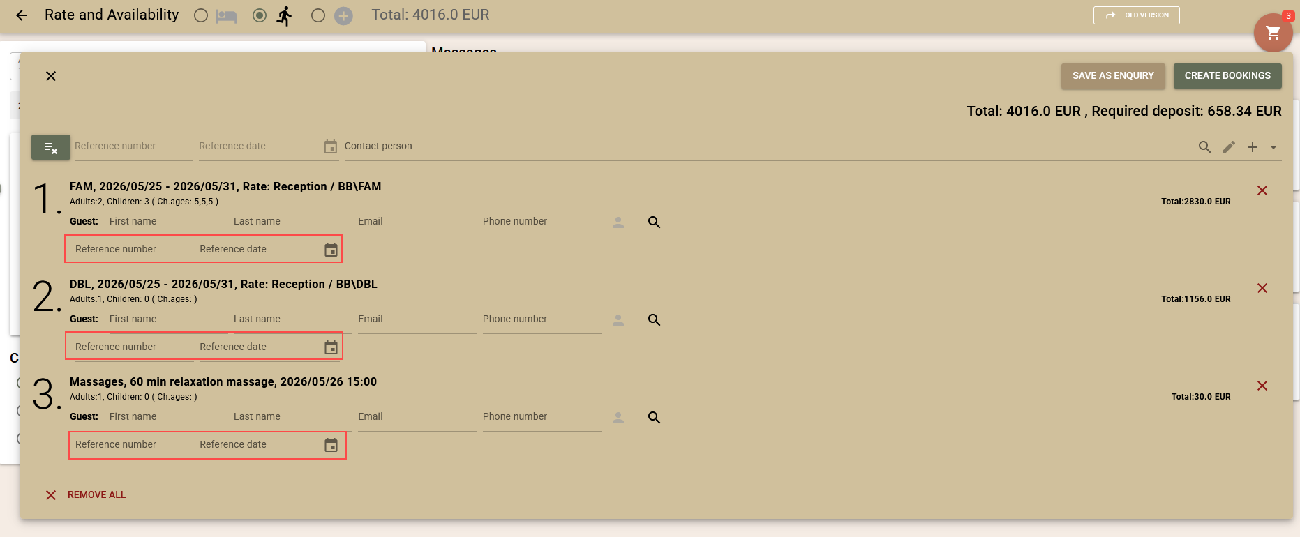 The reference data includes reference number and reference date. The reference number serves as a grouping marker for the bookings to which it is applied, and the reference date can be important for calculating the price (e.g. for discounts under tour operator agreements). You can set a common reference for all bookings in the cart or separate reference data for each booking.