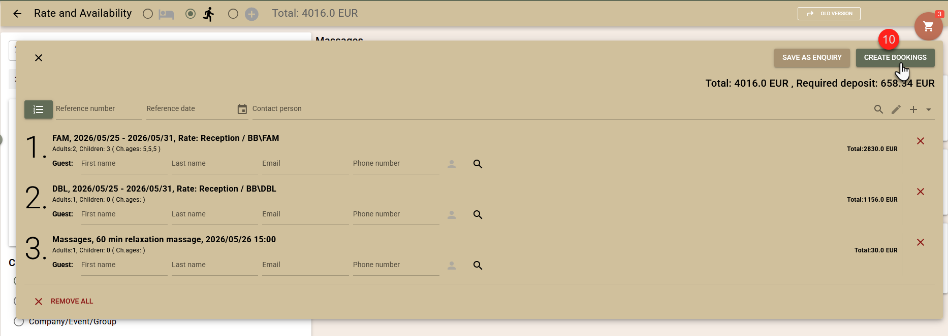 Once you have ensured that the bookings in the cart are added correctly and you have filled in the necessary information, confirm their creation via the "Create bookings" button (10).