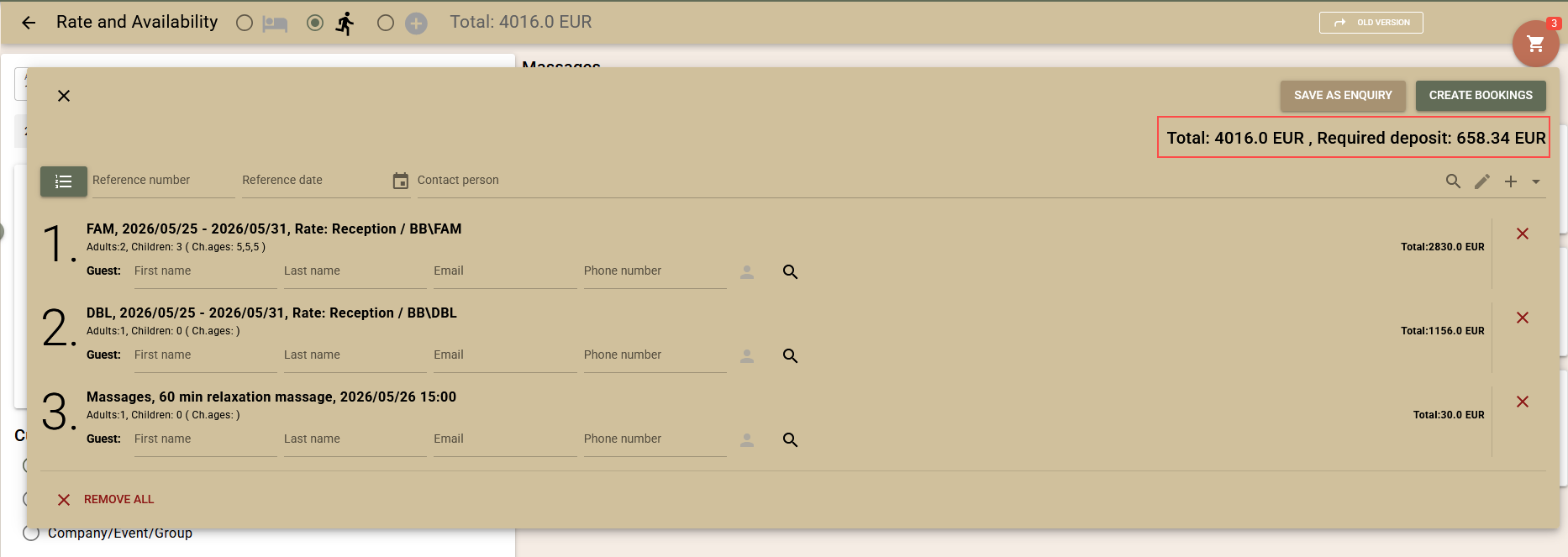 You will see all added bookings. A final price is calculated for each booking, and above the list of bookings are shown the total amount of all products in the cart and the amount of the required deposit.