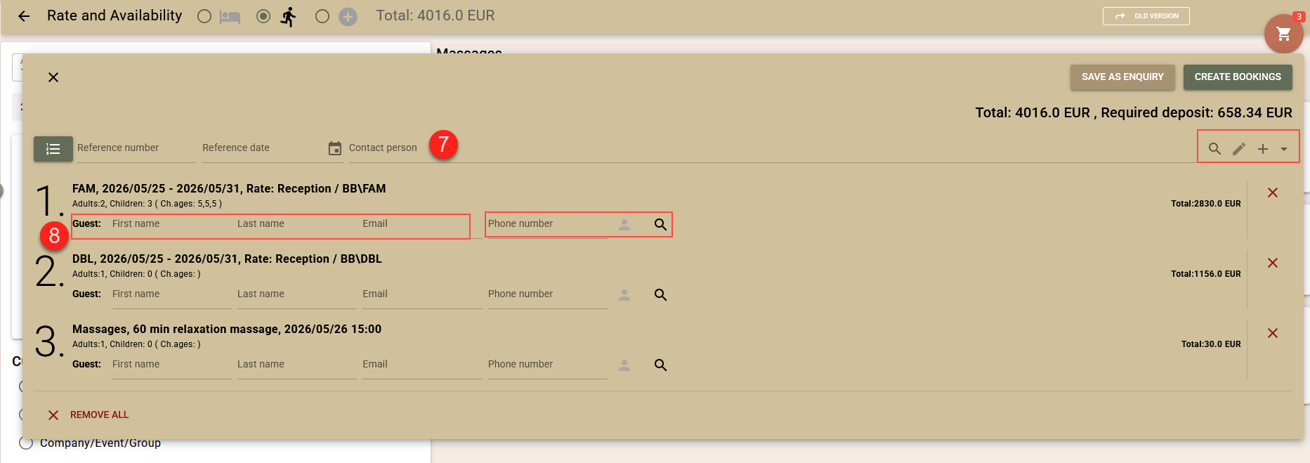 • Contact person (7) – you can select an existing guest profile or create a new profile, which will be saved as the contact person for the bookings in the cart. To search existing profiles, use the button with the “magnifying glass“ icon, and to add a new profile – the button “+“. The system will automatically suggest profiles linked to the selected Company or Returning guest.