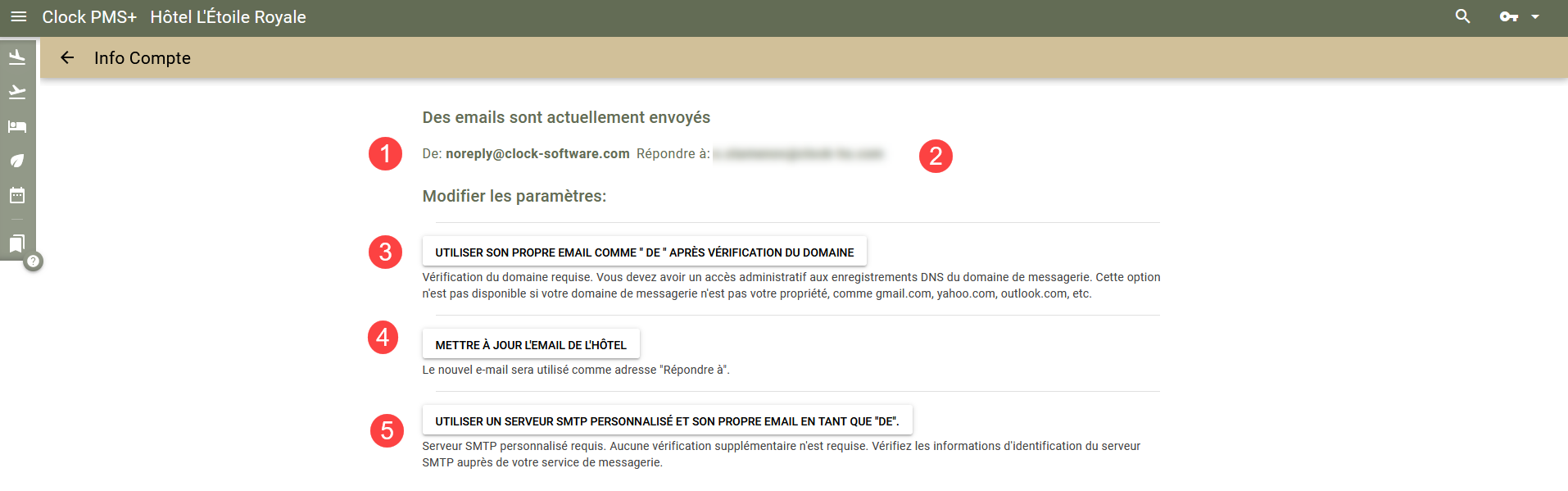 - Mettre à jour l'email de l'hôtel (3) - utilisez cette option si vous souhaitez changer l'adresse 'Répondre à'. L'adresse 'De' restera noreply@clock-......