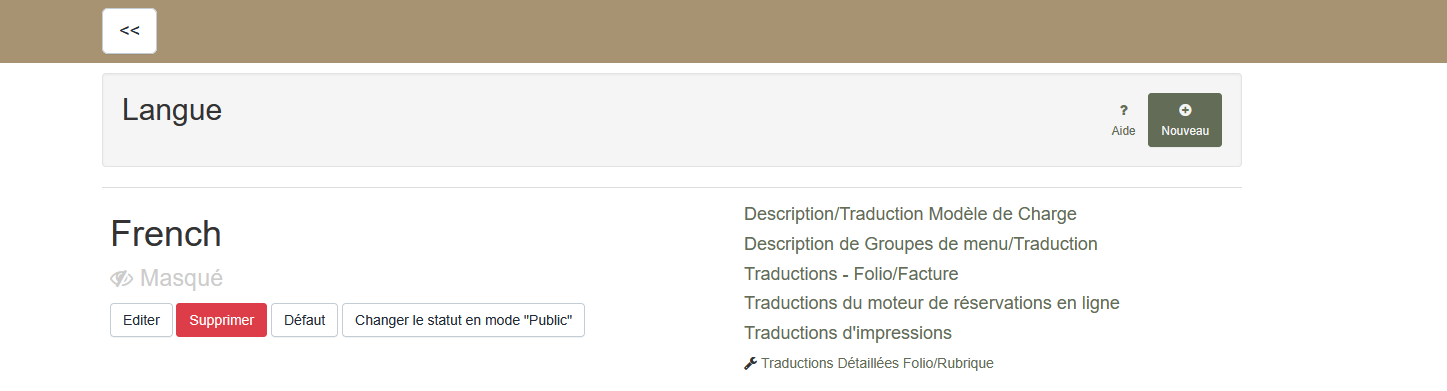 - Pour qu'une langue puisse être affichée dans votre moteur de réservation Clock POS Web, elle doit être rendue 'Publique'. Cette tâche peut être effectuée en cliquant sur le bouton 'Rendre publique'.