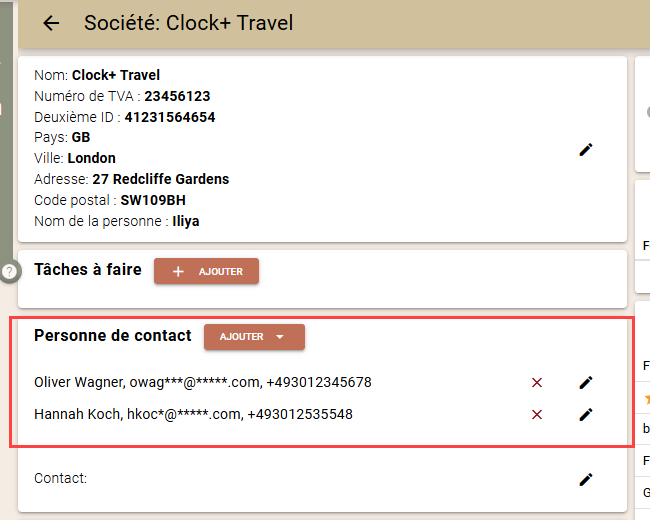 La fonctionnalité Contact peut également être utilisée sur l'écran Société. Vous pouvez ajouter plusieurs personnes de contact à une entreprise. Outre le fait qu'il s'agit d'informations de référence sur l'écran Société, vous pouvez facilement choisir les personnes de contact dans les réservations parmi celles qui sont liées à la société donnée. Veuillez consulter les captures d'écran ci-dessous: