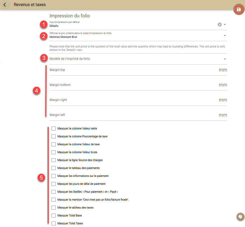- Afficher le prix unitaire dans l'impression du folio (2) - sélectionnez si le prix unitaire des services doit être affiché dans l'aperçu des détails. Vous pouvez choisir un prix unitaire net ou brut;
