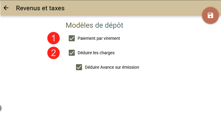 Pour travailler avec des acomptes, vous devez avoir activé le mode de dépôt "Déduire les frais"(2). Les acomptes comprennent :