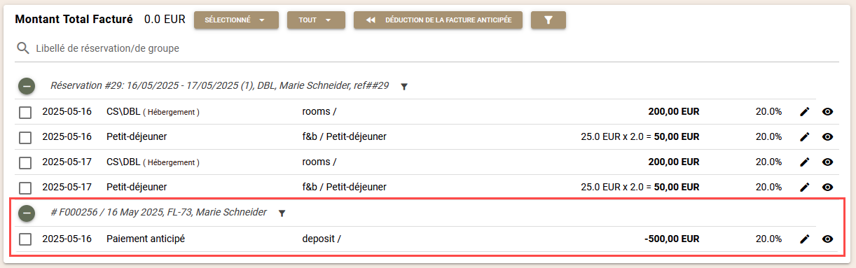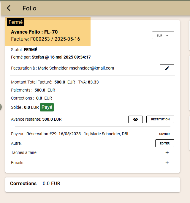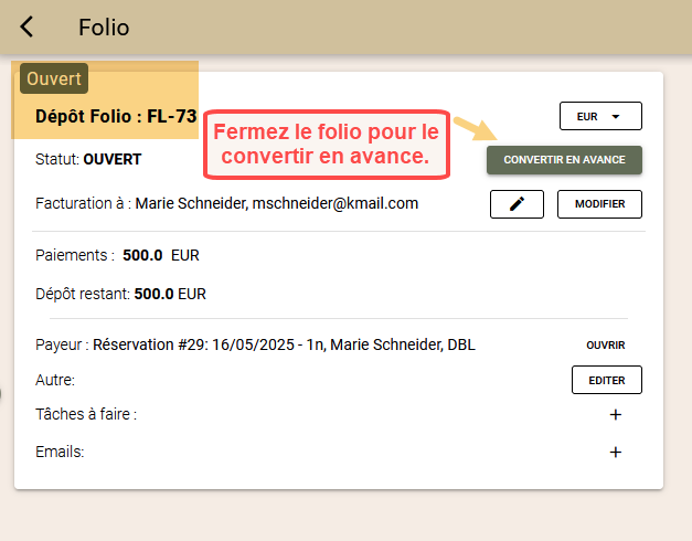 - Chaque folio de dépôt peut être transformé en folio d'acompte en clôturant ce folio de dépôt.