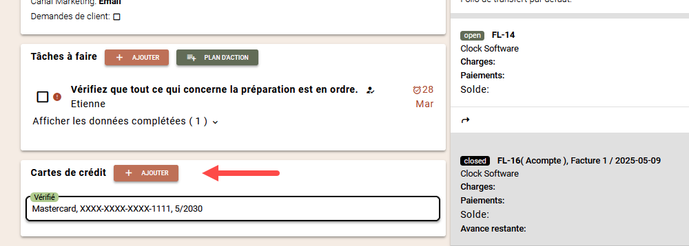 Vous pouvez enregistrer les détails de la carte de crédit dans la page de l'événement. Si vous disposez d'un processeur de paiement pris en charge par Clock, vous pouvez utiliser les détails enregistrés pour facturer des montants via le folio.