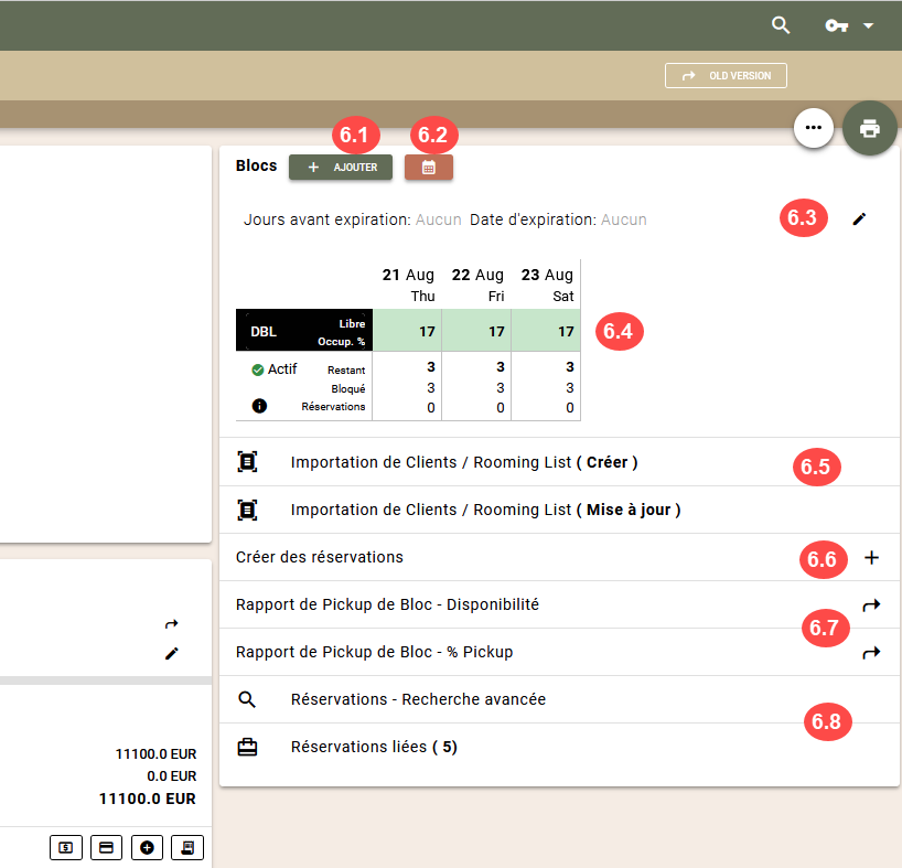 - Un tableau récapitulatif des blocs et de leur tarif est disponible via le bouton calendrier (6.2);