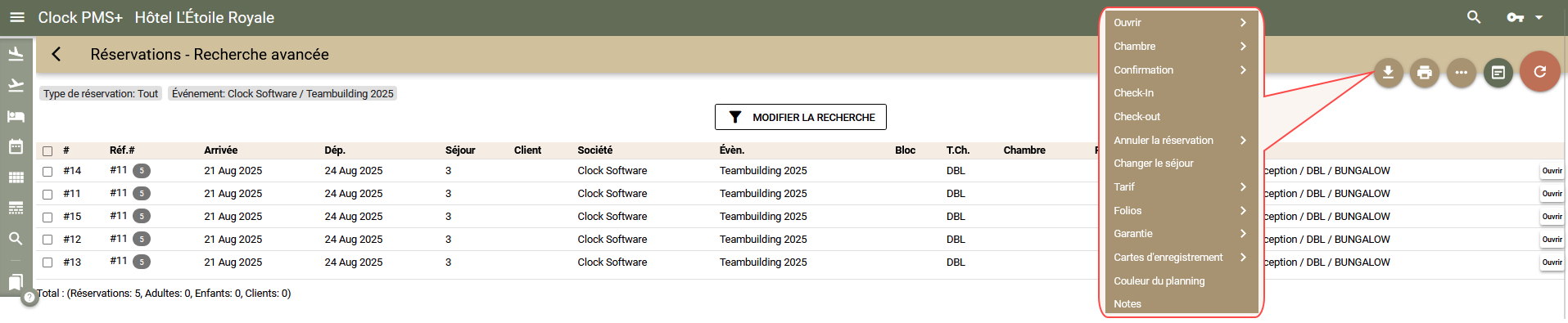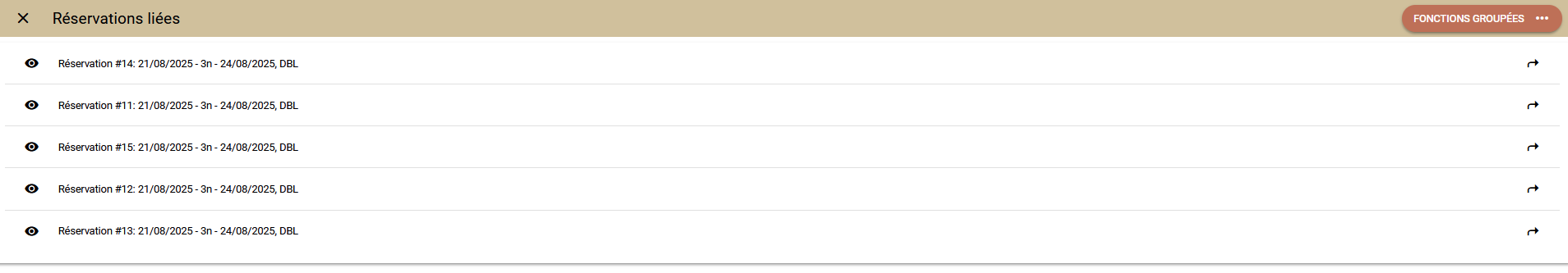- Vous pouvez charger toutes les réservations associées à l'événement en cliquant sur le bouton Réservations liées (6.8). Toutes les réservations seront listées et vous pourrez soit les ouvrir individuellement, soit utiliser le bouton 'Fonctions groupées' pour les charger en vue d'une édition de masse