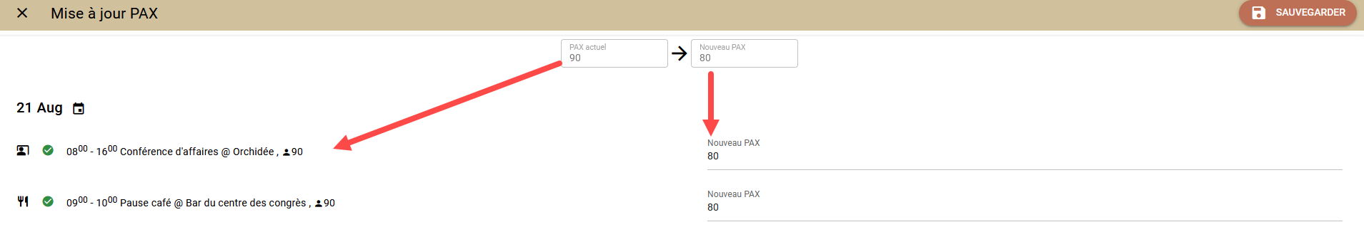 Appuyez sur le bouton Modifier PAX (1) et sur l'écran suivant, indiquez le nouveau nombre de PAX. Le système répertorie toutes les activités et indique automatiquement le nouveau nombre de PAX pour chaque activité qui comptait 90 PAX à l'origine :
