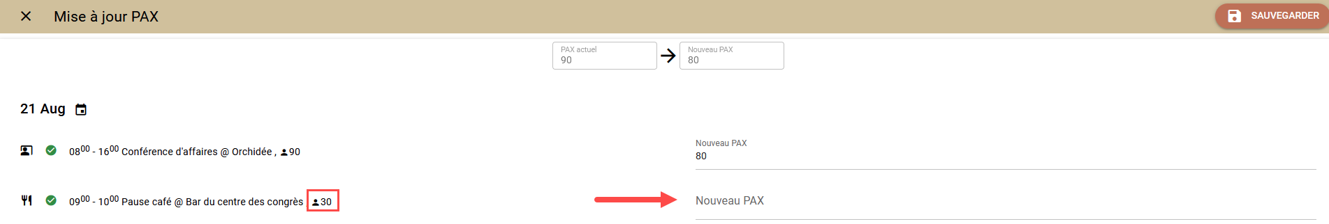 Au cas où une activité particulière aurait un nombre de PAX différent des 90 par défaut, par exemple si l'activité de restauration n'est pas effectuée par tous les clients, le champ « Nouveau PAX » sera vide et vous pourrez soit le sauvegarder tel quel, soit saisir une nouvelle valeur :