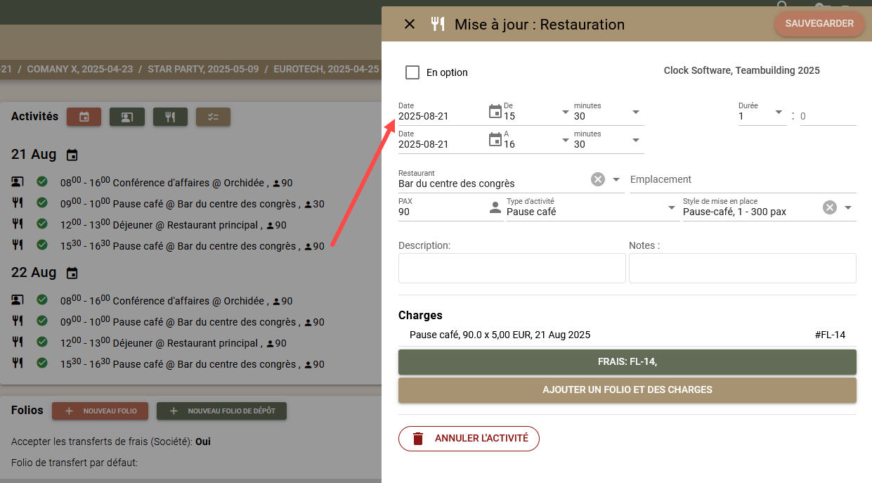 Lorsque l'on modifie la période de l'événement ou les réservations de salles de réunion et de restauration liées, la date de service des frais dans les folios ouverts sera automatiquement modifiée en fonction de la nouvelle période.
