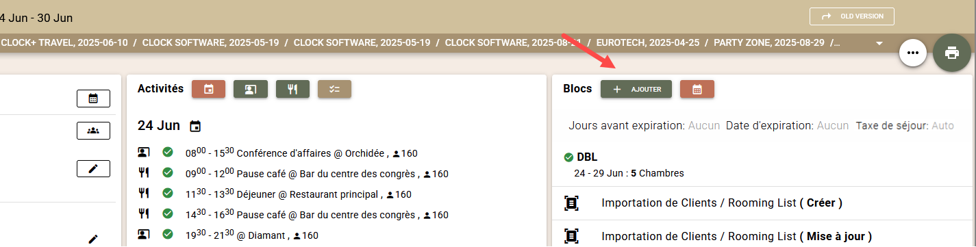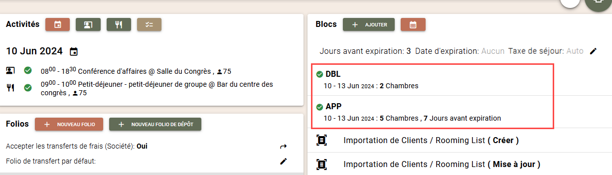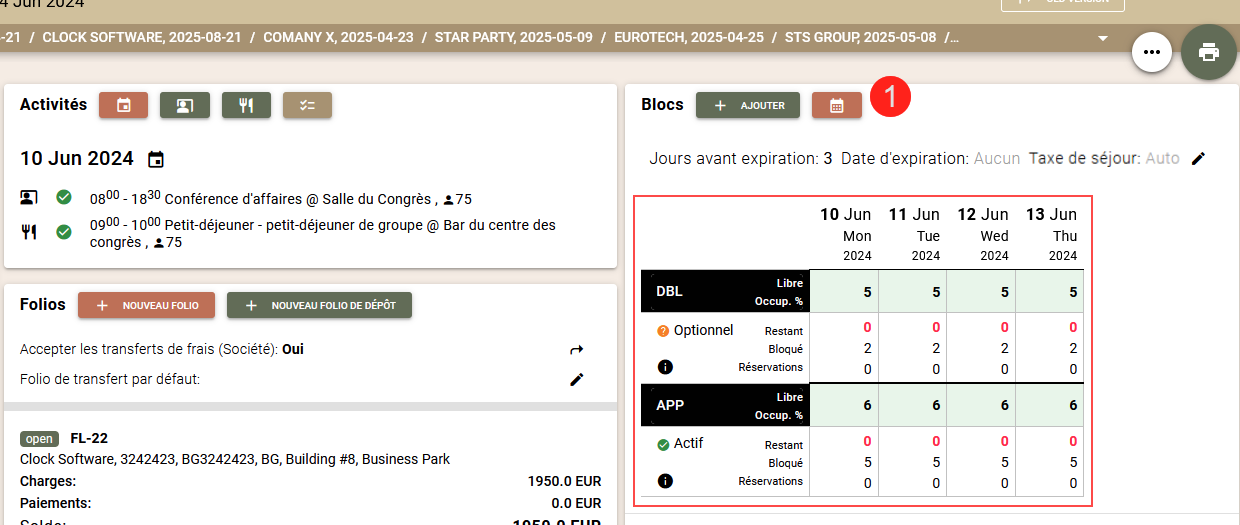 Important: La fonction Blocs est particulièrement utile pour gérer les grands groupes qui souhaitent séjourner dans votre propriété et qui n'organisent pas d’événement, par exemple pour les allotements des Tours Opérateurs ou les Tours Séries.
