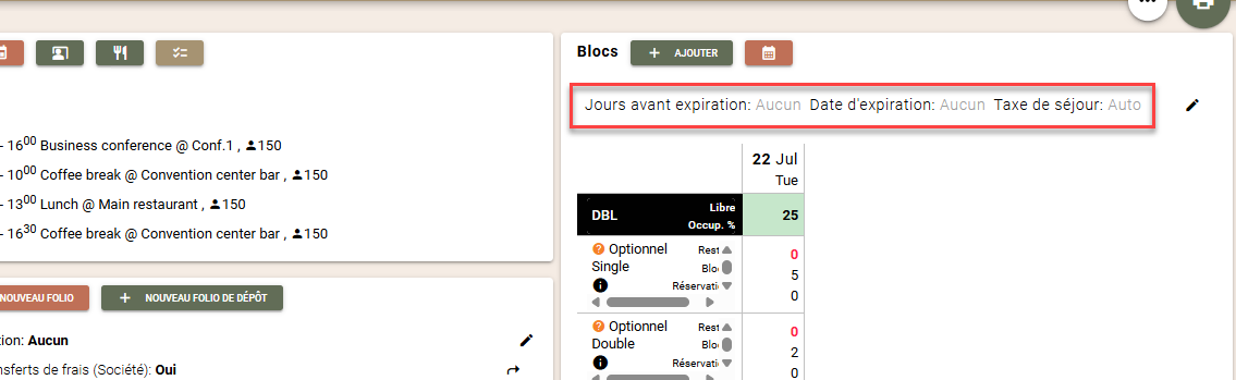 Remarque : Cela permet de fixer des Jours avant expiration pour tous les blocs et pour toutes les périodes. Par ailleurs, chaque bloc/période peut avoir une période de validation différente. Par exemple, les blocs en période de haute saison peuvent avoir une période de validation plus courte.